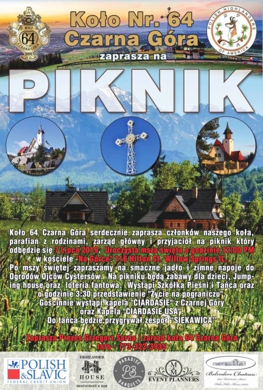 Zarząd Koła Nr 81Bustryk serdecznie zaprasza całą Polonię i brać góralską, sympatyków, Bustrycanów na piknik w niedzielę 7 lipca br. do Slovenian Catholic Mission przy 14246 Main St. w Lemont. Piknik rozpocznie się Mszą św. o godz. 11: 30 przed południem, którą odprawi ks. Paweł Komperda, kapelan Koła za żywych członków koła oraz za zmarłych: Władysław Styrczula Maśniak, Józef Korkosz, Stanisław Pająk, Helena Jarosz, Anna Żegleń i Halina Tylka. Zapewniamy obficie zaopatrzoną kuchnię i zimne napoje. Występ zespołu działającego przy kole Bustryk „Wiyrchy”.