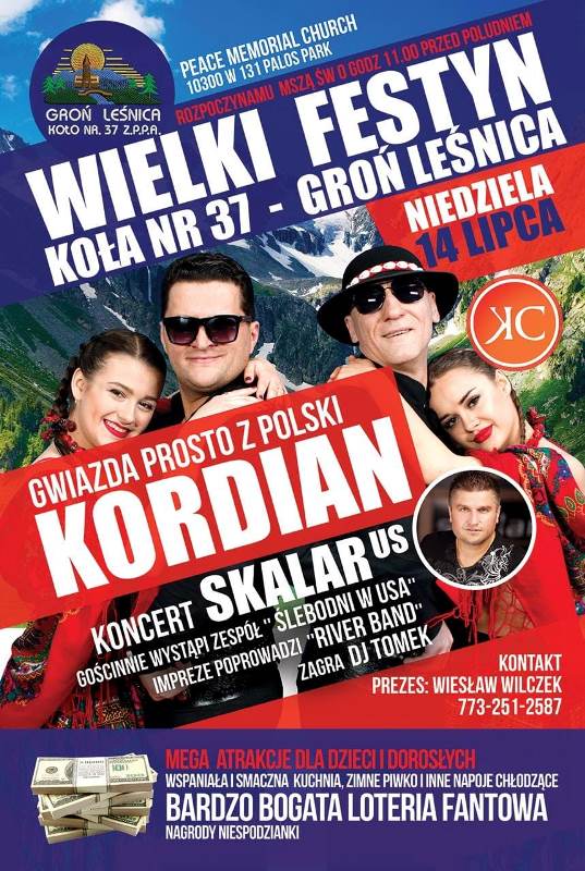 Zarząd Kola Nr 37 Gron Leśnica serdecznie zaprasza na Wielki Festyn w niedzielę 14 lipca br. Rozpoczęcie Mszą Św. o godz. 11: 00 przed południem w Peace Memorial Church przy 10300 W. 131 Str. Palos Park. Moc atrakcji dla dzieci i dorosłych.