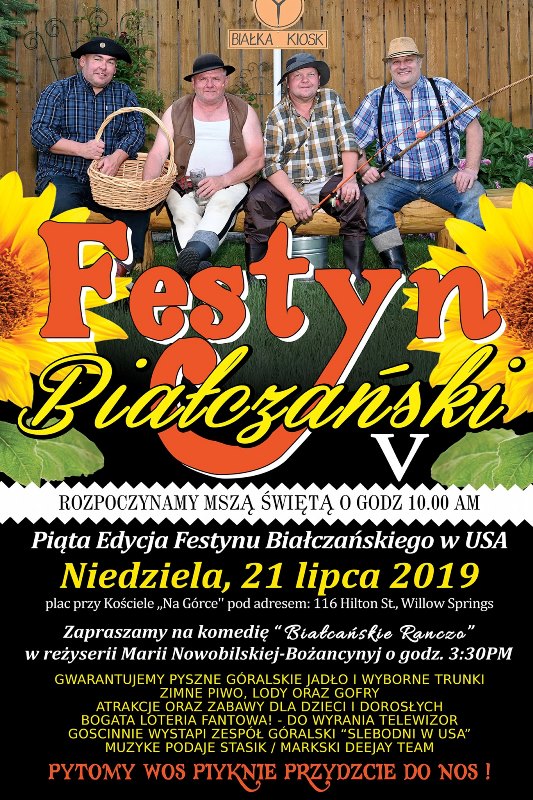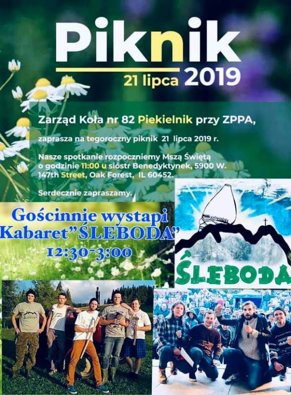Zarząd Koła Nr 24 Szaflary serdecznie zaprasza na „Szaflarzański piknik”, który odbędzie się w niedzielę 21 lipca 2019r. w Slovenian Catholic Mission przy 14246 Main Street w Lemont. Piknik rozpocznie się Mszą św. o godz. 12: 00 w południe. Organizatorzy zapewniają wiele atrakcji dla dzieci i dorosłych: jumpery, gry i konkursy, program artystyczny przedstawi zespół „Mali Szaflarzanie”, bogata loteria fantowa, smaczne jedzenie i zimne napoje. Do tańca przygrywać będzie góralska kapela i zespół „Siekawica”. Więcej informacji pod numerem (773) 576-4650.