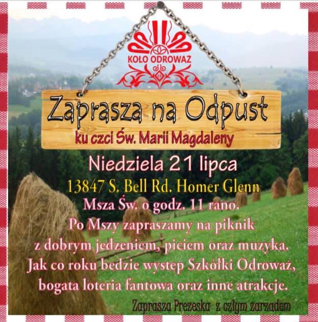 Koło Nr 23 Odrowąż Podhalański im. Dr Jakuba Zachemskiego serdecznie zaprasza parafian Odrowązkich, bratnie koła i całą Polonie na uroczystość odpustową ku czci Św. Marii Magdaleny w niedzielę 21 lipca br. do Homer Glen przy 13847 S. Bell Rd. u Serbów, naprzeciw Menards, to samo miejsce jak w zeszłym roku. Rozpoczniemy Mszą Św. odpustową o godz. 11: 00 przed południem. Kuchnia gwarantuje smaczne jedzenie, zimne napoje. Dla dzieci darmowa loteria fantowa gry i zabawy. Występ dzieci ze Szkółki Odrowęzianie.