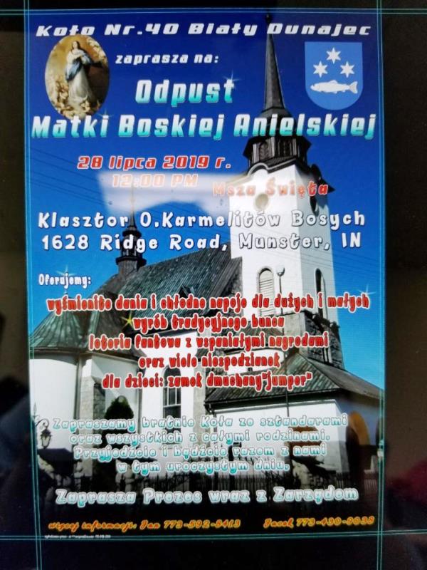Zarząd Kola Nr 40 Biały Dunajec serdecznie zaprasza wszystkich Białodunajczan, bratnie Koła ze sztandarami oraz wszystkich z całymi rodzinami na Odpust Matki Boskiej Anielskiej, który odbędzie się w niedzielę 28 lipca br. w Klasztorze Ojców Karmelitów Bosych przy 1628 Ridge w Road Munster Indiana. Rozpoczynamy Mszą Św. o godz. 12: 00 w południe, po Mszy Św. odbędzie się piknik. Oferujemy wyśmienite gorące dania i chłodne napoje dla starszych i młodszych. Przewidywane: wyrób tradycyjnego bunca, loteria fantowa ze wspaniałymi nagrodami, dla dzieci zamek dmuchany “jumper “ inne atrakcje.