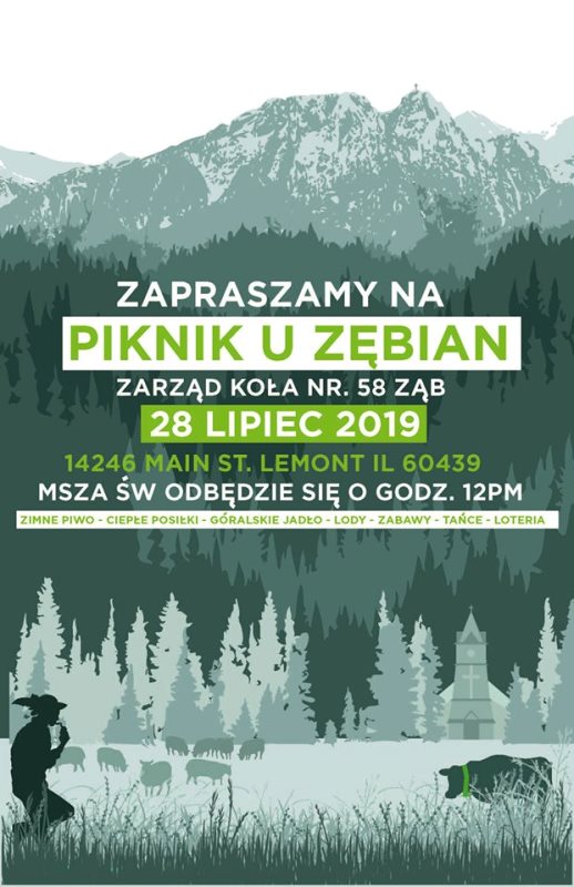 Zarząd Koła Nr 58 Ząb serdecznie zaprasza całą Polonię i brać góralską, sympatyków, wszystkich Zębianów na piknik w niedzielę 28 lipca br. do Slovenian Catholic Mission przy 14246 Main St. w Lemont. Piknik rozpocznie się Mszą św. o godz. 12: 00 w południe, którą odprawi ks. Paweł Komperda, kapelan Koła. Po mszy św. zapraszamy na wspaniale góralskie jadło, zimne napoje, Zębiańskie lody.