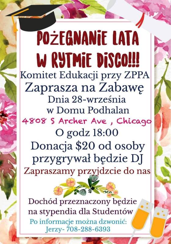 Komitet Edukacji przy ZG ZPPA serdecznie zaprasza na zabawę 28 września br. do Domu Podhalan. Rozpoczęcie o godz. 6: 00 wieczorem. Donacja 20$ od osoby. Zabawę poprowadzi DJ. Dochód przeznaczony będzie na stypendia dla studentów.