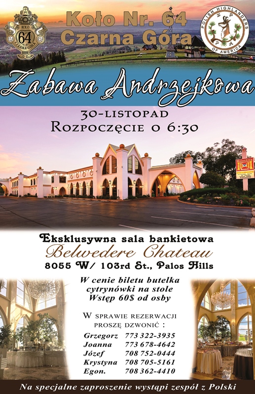 Koło 64 Czarna Góra serdecznie zaprasza na „Zabawę Andrzejkową”, która odbędzie się w sobotę 30 listopada br. w ekskluzywnych salach BELVEDERE CHATEAU pod adresem 8055 W 103rd Str. w Palos Hills W cenie biletu: smaczny obiad, słodki i szwedzki stół oraz butelka „Cornogórskiego napitku”na stole. Będzie wybierana królowa róż, cena biletu: 60$ od osoby. Na specjalne zaproszenie wystąpi zespół z Polski