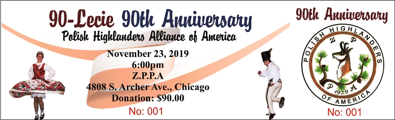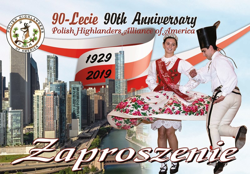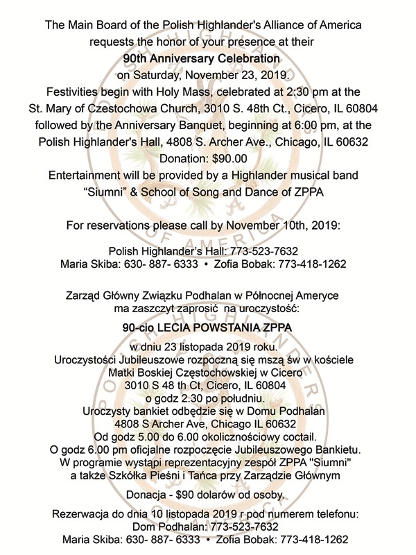 Zarząd Główny ZPPA serdecznie zaprasza na obchody 90 lecia powstania Związku Podhalan w Północnej Ameryce w sobotę 23 listopada 2019r. Uroczystości rozpoczną się Mszą Św. o godz. 2: 30 po południu w kościele Matki Boskiej Częstochowskiej w Cicero. Po Mszy zapraszamy na dalsze uroczystości do Domu Podhalan gdzie pomiędzy 5: 00 do 6: 00 będzie okolicznościowy cocktail, zaś godz. 6: 00 wieczorem nastąpi oficjalne otwarcie Jubileuszowego Bankietu. W programie występ zespołu Siumni i Szkółki przy ZG ZPPA. Do tańca grał będzie Marcus Band. Donacja $ 90 od osoby.