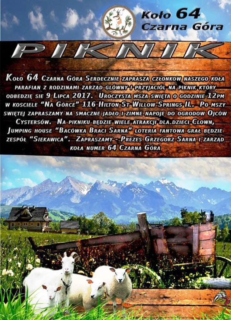 Koło Nr 64 Czarna Góra serdecznie zaprasza członków naszego koła parafian z rodzinami Zarząd Główny i przyjaciół na piknik, który odbędzie się w niedziele 9 lipca br. Uroczysta msza święta o godzinie 12: 00 w południe w kościele "Na Górce" przy 116 Hilton St. Willow Springs. Po Mszy świętej zapraszamy na smaczne jadło i zimne napoje do ogrodów Ojców Cystersów Na pikniku będzie wiele atrakcji dla dzieci Clown Jumping House "Bacówka braci Sarna “loteria fantowa grał będzie zespół "Siekawica" Zapraszamy-prezes Grzegorz Sarna i Zarząd Koła Nr 64 Czarna Góra
