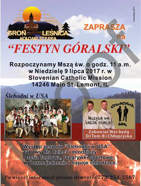 Zarząd Koła Nr 37 Groń – Leśnica zaprasza na Festyn, który odbędzie się w niedzielę 9 lipca br. w Slovenian Catholic Mission w Lemont. Rozpoczęcie Mszą św. o godz. 11.00 przed południem. Jak co roku z kołem Groń Leśnica - wspaniała zabawa!!