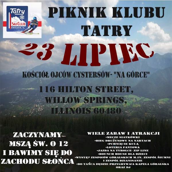 Zarząd Koła Nr 24 Szaflary oraz Klub Sportowy LZS Szaflary zapraszają na piknik, który odbędzie się w niedzielę 23 lipca br. w Slovenian Catholic Mission przy 14246 Main Street w Lemont. W tym roku w nowym miejscu!!! Piknik rozpocznie się Mszą św. o godz. 10: 30 przed południem. Na Mszy św. poświęcony będzie odnowiony pierwszy sztandar koła. Organizatorzy zapewniają wiele atrakcji dla dzieci i dorosłych: jumpery, gry i konkursy, program artystyczny, bogata loteria fantowa- do wygrania laptop i inne wartościowe nagrody. Smaczne jedzenie i zimne napoje.