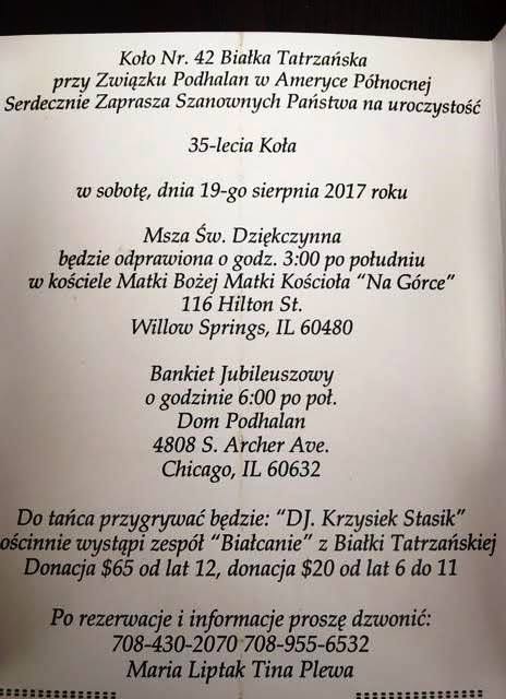 35 lecie Kola Nr 42 Białka Tatrzańska - Zaproszenie