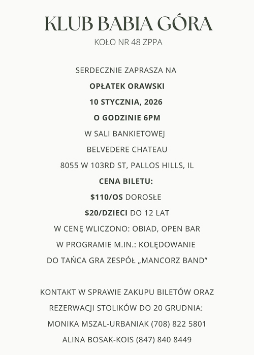 Podczas spotkania podsumujemy naszą całoroczną działalność, omówimy bieżące sprawy Związku oraz przygotowania do zimowego kalendarza wydarzeń. Będzie to również okazja, aby podziękować sobie nawzajem za wspólną pracę, zaangażowanie i troskę o zachowanie naszej podhalańskiej tradycji na ziemi amerykańskiej.