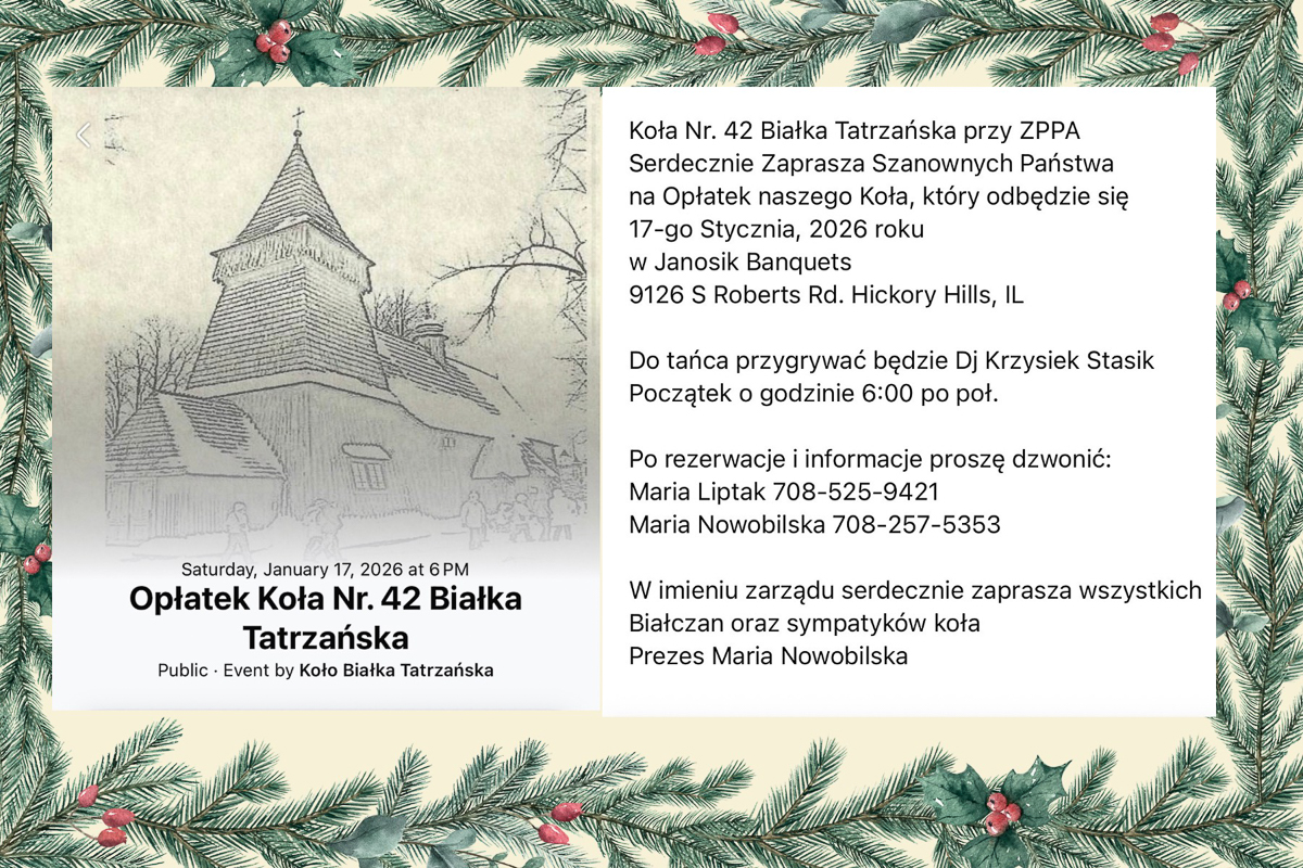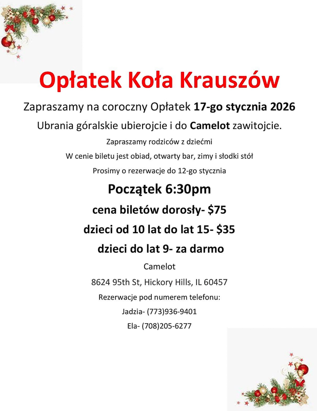 Polski Klub działający w Parafii sw. Faustyny Kowalskiej, wraz z Proboszczem i zarazem Kapelanem Klubu, Ks. Tadeuszem Dzieszko, serdecznie zapraszają na ZABAWĘ SYLWESTROWĄ w Parafialnej Sali Ward Hall, 5157 S. McVicker Ave., Chicago, IL 60638. Zapewniamy smaczny obiad, wspaniałą zabawę którą poprowadzi „Duet Ich Troje”, szampan i coś smacznego na danie o północy, akcesoria sylwestrowe oraz inne niespodzianki i atrakcje. Uwaga! Dla rodziców którzy posiadają dzieci, zapewnimy dla dzieci wieczorną opiekę i specjalne zabawy w sali obok. Bilety w cenie tylko $100 od osoby