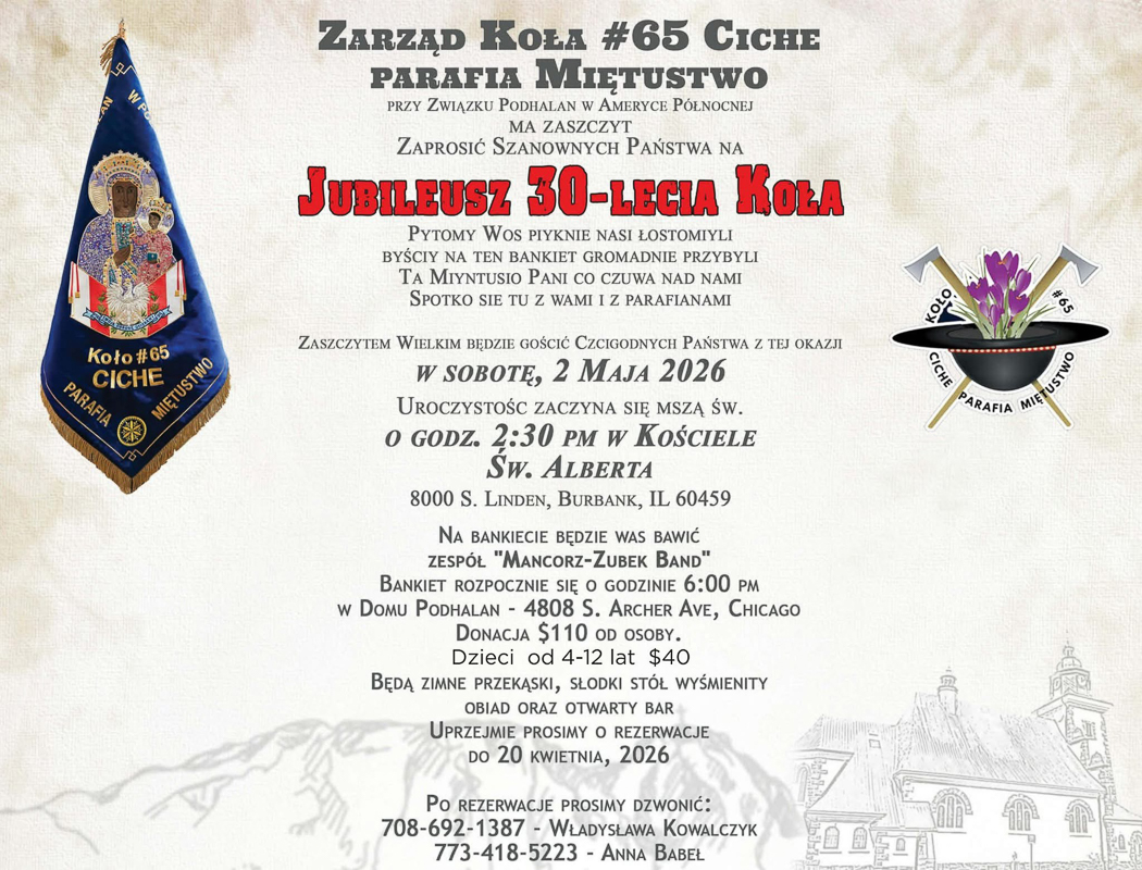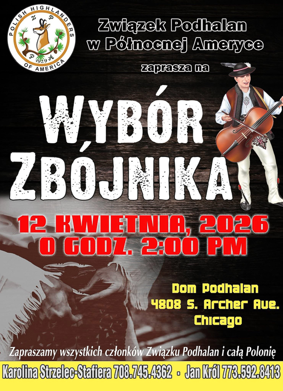 Jednocześnie serdecznie zapraszamy na comiesięczne zebranie Prezesów i Dyrektorów ZPPA, które odbędzie się w piątek, 10 kwietnia 2026 roku o godz. 19:30 w Domu Podhalan przy 4808 S. Archer Ave w Chicago. Zebranie rozpoczniemy uroczystym upamiętnieniem kolejnej rocznicy Zbrodni Katyńskiej oraz Katastrofy Smoleńskiej, po czym przejdziemy do spraw organizacyjnych.