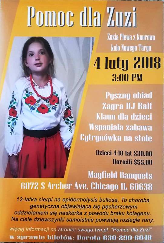 3: 00 po południu w Mayfield Banquet Archer Ave, donacja: dorośli 55$ dzieci 30$, pyszny obiad, DJ, klaun dla dzieci butelka cytrynówki na stół i super zabawa, loteria fantowa! 12-latka cierpi na epidermolysis bullosa, to choroba genetyczna objawiająca się pęcherzowym oddzielaniem się naskórka z powodu braku kolagenu, na ciele dziewczynki powstają samoistnie rozległe rany. ,,Czasami mam dosyć, nie chcę nowych zabawek i ubrań, chciałabym być zdrowa mówi Zuzia! Otwórzmy nasze serca na chorobę Zuzi wszystkich serdecznie zapraszamy na bankiet charytatywny więcej informacji pod