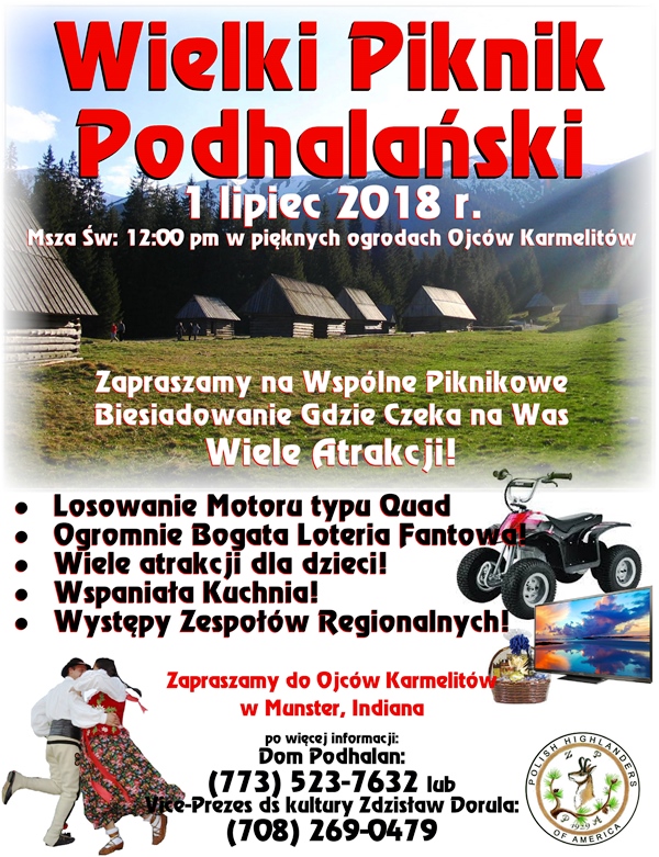Koło Nr 25 Parafii Harklowa serdecznie zaprasza Podhalan i całą Polonię na piknik, który odbędzie się w niedzielę 24 czerwca br. w Country Lane Woods przy 95th St. Palos Hills. Rozpoczęcie Mszą Św. o godz. 12: 00 w południe. Kuchnia gwarantuje smaczne jedzenie, zimne napoje, a dla dzieci przewidziano gry i zabawy, loteria fantowa. Kapela góralska i muzyka do tańca umili nam czas. Przyjdźcie z całymi rodzinami, będzie wesoło.