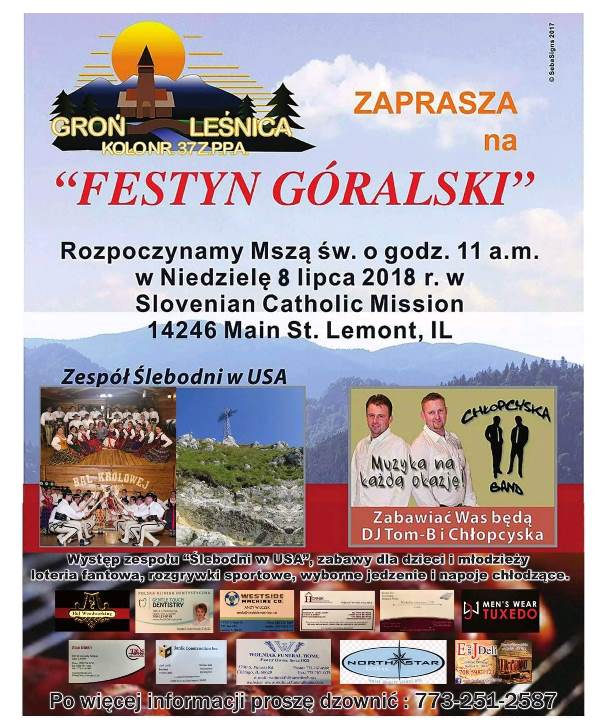 Zarząd Koła Nr. 37 Groń Leśnica zaprasza na Wielki Festyn Góralski w niedzielę 8 lipca 2018r do Slovenian Catholic Mission przy 14246 Main St. Lemont Il.