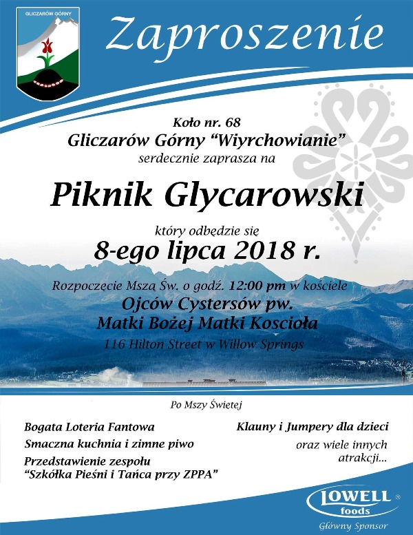 Zarząd Koła Nr 68 Gliczarów Górny "Wiyrchowianie, “ serdecznie zaprasza wszystkich Gliczarowian z rodzinami, przyjaciół, sympatyków, bratnie koła jak i członków ZG ZPPA i całą Polonię na piknik, który odbędzie się w niedzielę 8 lipca br. Rozpoczęcie Mszą Św. o. godz.12: 00 w południe w kościele u Ojców Cystersów na Górce przy116 Hilton St. Willow Springs. Po Mszy Św. zapraszamy na smaczne jedzenie, zimne napoje i dobrą zabawę. Dla dzieci będzie przygotowane wiele atrakcji, gier sportowych a dla najmłodszych jumper, zabawa z Klaunem. Przewidziana jest bogata loteria fantowa. Oprawa muzyczna DJ. Muzyka góralska, występ Szkółki Pieśni i Tańca przy ZG ZPPA.