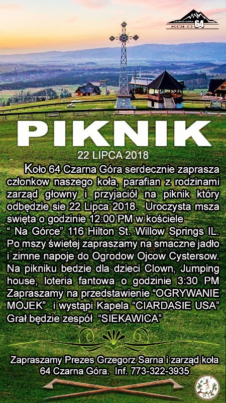 Koło Nr. 64 Czarna Góra serdecznie zaprasza członków naszego koła, parafian z rodzinami, Zarząd Główny ZPPA i przyjaciół na piknik, który odbędzie się w niedzielę 22 lipiec 2018. Uroczysta msza św. o godz. 12: 00 w południe, w kościele "Na Górce" przy 116 Hilton St. Willow Springs IL.