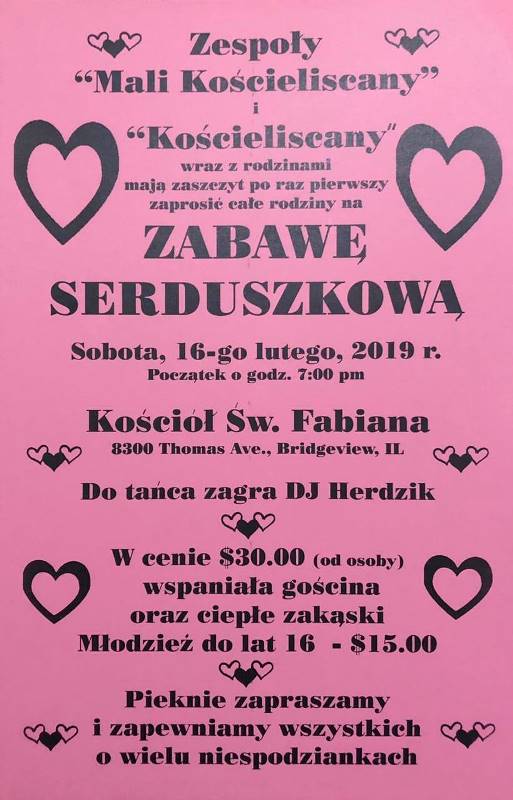 Zespoły „Mali Kościeliscany” i „Kościeliscany” przy Kole Nr 54 Kościelisko Polaniorze zapraszają na Zabawę Serduszkową, w sobotę 16 lutego 2019 r godz. 7: 00 wieczorem sala przy kościele Św. Fabiana przy 8300 S. Thomas Ave. w Bridgeview. Donacja $30.00 od osoby, młodzież do lat 16. $ 15. Gra DJ. Herdzik. Głównym celem naszej imprezy jest zebranie funduszy na pokrycie kosztów związanych z wyjazdem naszych zespołów na Festiwal do Arizony.