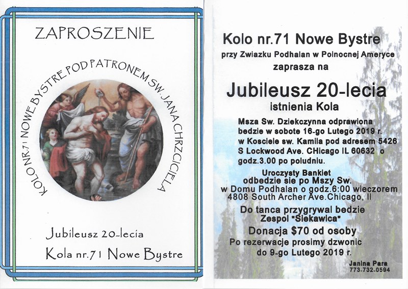 Zarząd Kola Nr 71 Nowe Bystre serdecznie zaprasza na XX lecie Koła w sobotę 16 lutego 2019 r. Msza Św. Jubileuszowa w kościele Św. Kamila o 3: 00 po południu. Uroczysty Bankiet w Domu Podhalan o 6: 00 wieczorem. Serdecznie zapraszamy bratnie kola ze sztandarami do kościoła a później na bankiet.