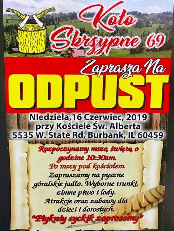 Klub Babia Góra Koło Nr 48 serdecznie zaprasza na Odpust Orawski w niedzielę 23 czerwca 2019 do Merrillville, IN przy 5755 Pennsylvania St. Msza święta połączona z procesją Bożego Ciała rozpocznie się o godz. 12.00 w południe w kościele Matki Bożej Częstochowskiej. W programie: występ zespołu Orawa, smaczne jedzenie z polowej kuchni, napoje chłodzące, loteria fantowa, gry i zabawy dla dzieci oraz rozgrywki sportowe dla dorosłych.