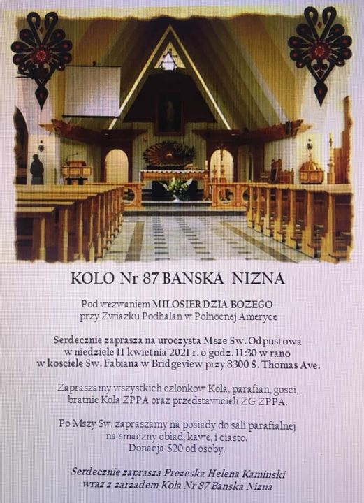W niedzielę 25 kwietnia 2021 r. o godz. 2 po południu w Domu Podhalan - 4808 S Archer Ave.