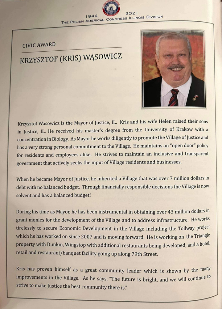 Jedno z prestiżowych wyróżnień Civic Award otrzymał Krzysztof Wąsowicz, burmistrz Miasta Justice, Illinois,