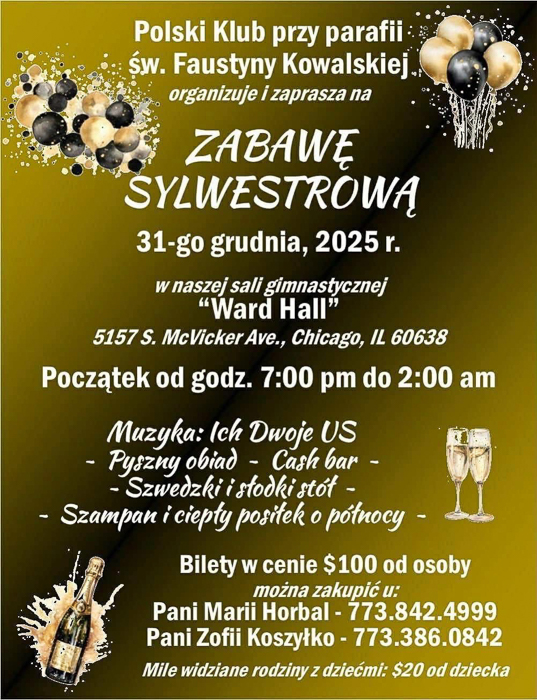 Polski Klub działający w Parafii sw. Faustyny Kowalskiej, wraz z Proboszczem i zarazem Kapelanem Klubu, Ks. Tadeuszem Dzieszko, serdecznie zapraszają na ZABAWĘ SYLWESTROWĄ w Parafialnej Sali Ward Hall, 5157 S. McVicker Ave., Chicago, IL 60638. Zapewniamy smaczny obiad, wspaniałą zabawę którą poprowadzi „Duet Ich Troje”, szampan i coś smacznego na danie o północy, akcesoria sylwestrowe oraz inne niespodzianki i atrakcje. Uwaga! Dla rodziców którzy posiadają dzieci, zapewnimy dla dzieci wieczorną opiekę i specjalne zabawy w sali obok. Bilety w cenie tylko $100 od osoby