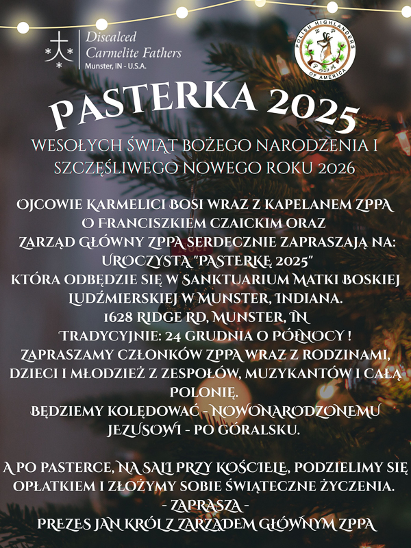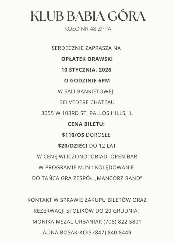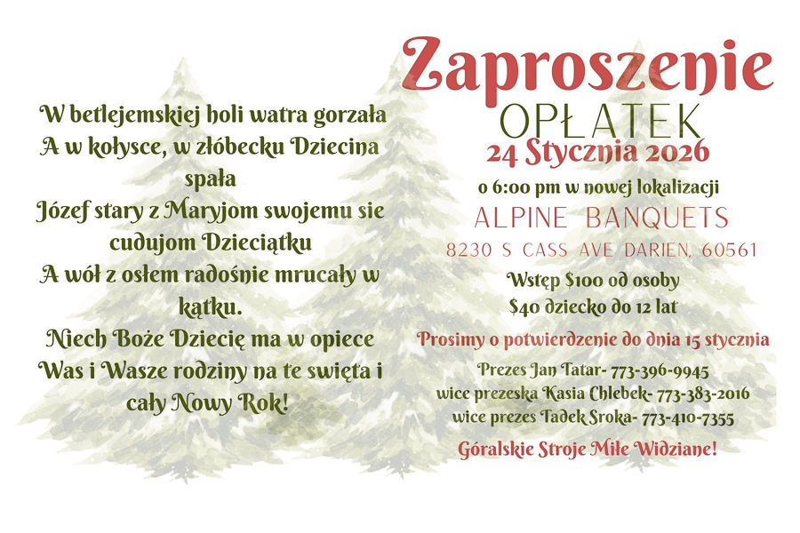Polski Klub działający w Parafii sw. Faustyny Kowalskiej, wraz z Proboszczem i zarazem Kapelanem Klubu, Ks. Tadeuszem Dzieszko, serdecznie zapraszają na ZABAWĘ SYLWESTROWĄ w Parafialnej Sali Ward Hall, 5157 S. McVicker Ave., Chicago, IL 60638. Zapewniamy smaczny obiad, wspaniałą zabawę którą poprowadzi „Duet Ich Troje”, szampan i coś smacznego na danie o północy, akcesoria sylwestrowe oraz inne niespodzianki i atrakcje. Uwaga! Dla rodziców którzy posiadają dzieci, zapewnimy dla dzieci wieczorną opiekę i specjalne zabawy w sali obok. Bilety w cenie tylko $100 od osoby