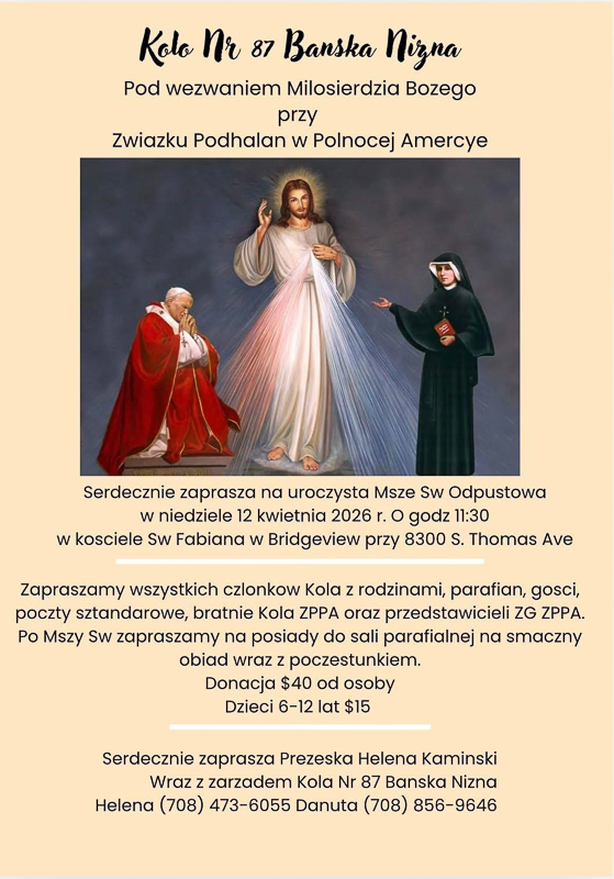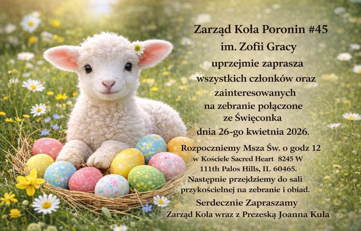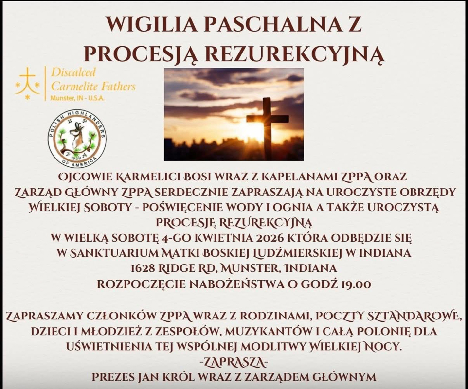 Na zakończenie pragniemy serdecznie zaprosić Państwa wraz z rodzinami na uroczyste obchody Wielkanocy, Wigilii Paschalnej oraz procesji rezurekcyjnej, które odbędą się w sobotę, 4 kwietnia 2026 roku o godz. 19:00 w Sanktuarium Matki Boskiej Ludźmierskiej w Munster, Indiana. Ojciec Karmelici Bosi wraz z Kapelanami ZPPA oraz Zarząd Główny zapraszają wszystkich członków, poczty sztandarowe, zespoły, muzykantów oraz Polonię do wspólnej modlitwy i uczestnictwa.