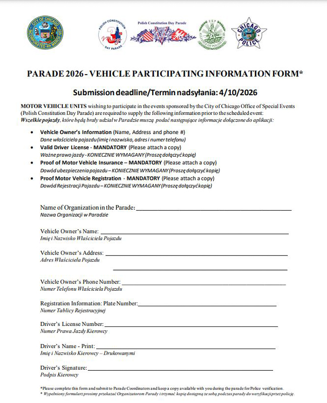 W załączniku przesyłamy formularz zgłoszeniowy dla grup pragnących wziąć udział w paradzie korzystając z pojazdu (rydwanu). Uprzejmie prosimy o jego wypełnienie oraz przesłanie informacji do piątku, 3 kwietnia 2026 roku na Ten adres pocztowy jest chroniony przed spamowaniem. Aby go zobaczyć, konieczne jest włączenie w przeglądarce obsługi JavaScript., lub Ten adres pocztowy jest chroniony przed spamowaniem. Aby go zobaczyć, konieczne jest włączenie w przeglądarce obsługi JavaScript. . Po zebraniu wszystkich zgłoszeń Zarząd Główny przekaże je do Komitetu Parady. Informujemy również, że w tym roku Związek Podhalan wystąpi jako jedna, wspólna grupa pod jednym numerem.