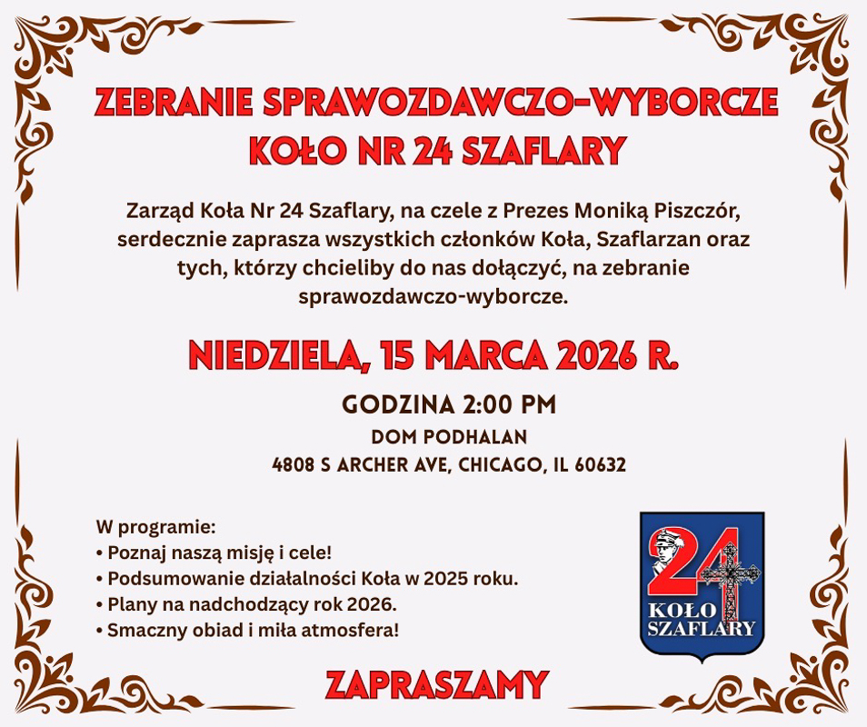 Zebranie odbędzie się 8 marca 2026 roku godz 3.30 PM